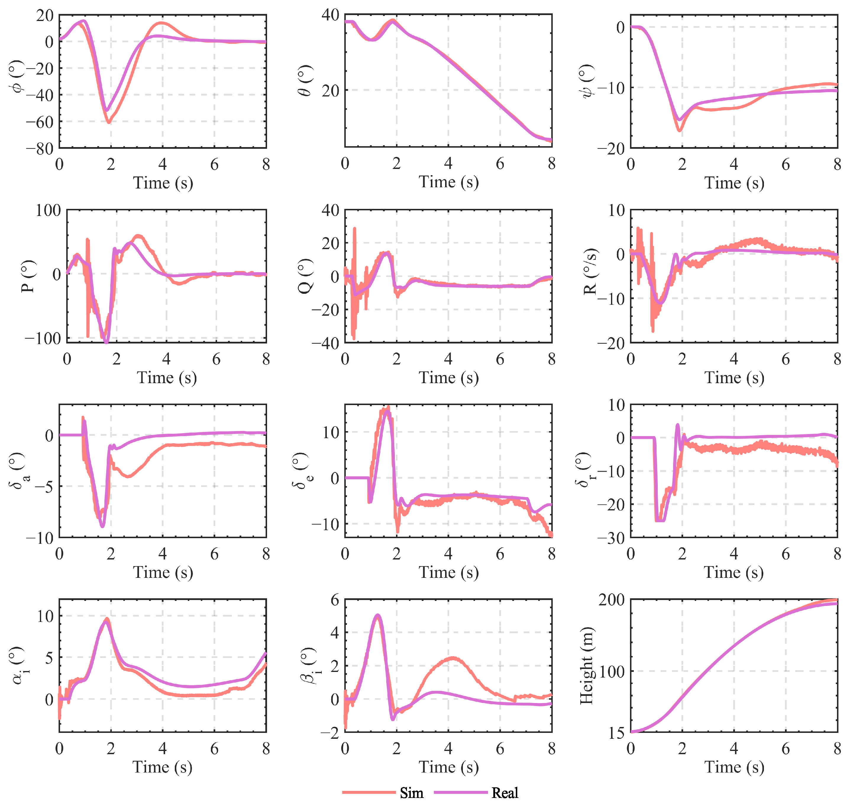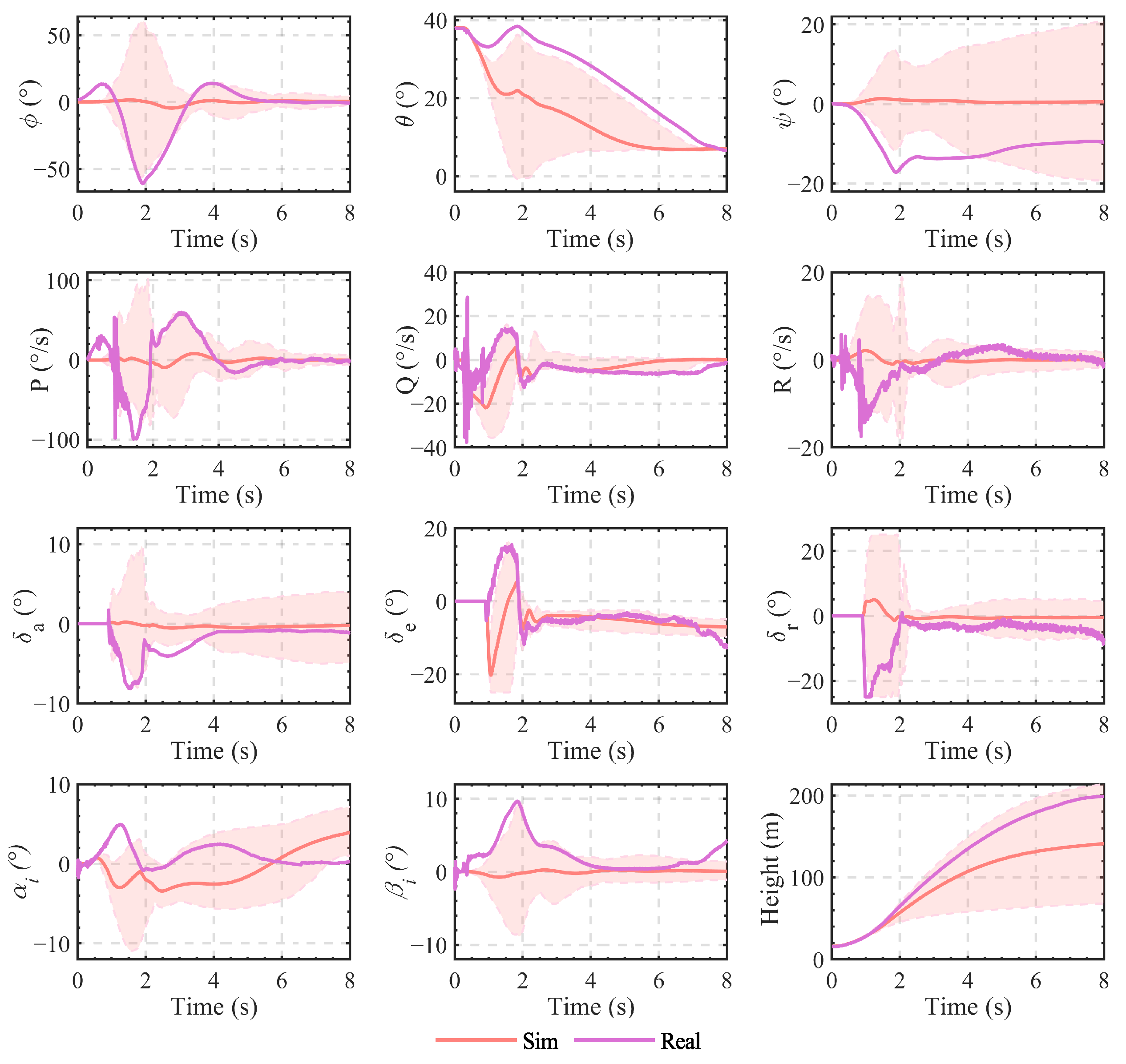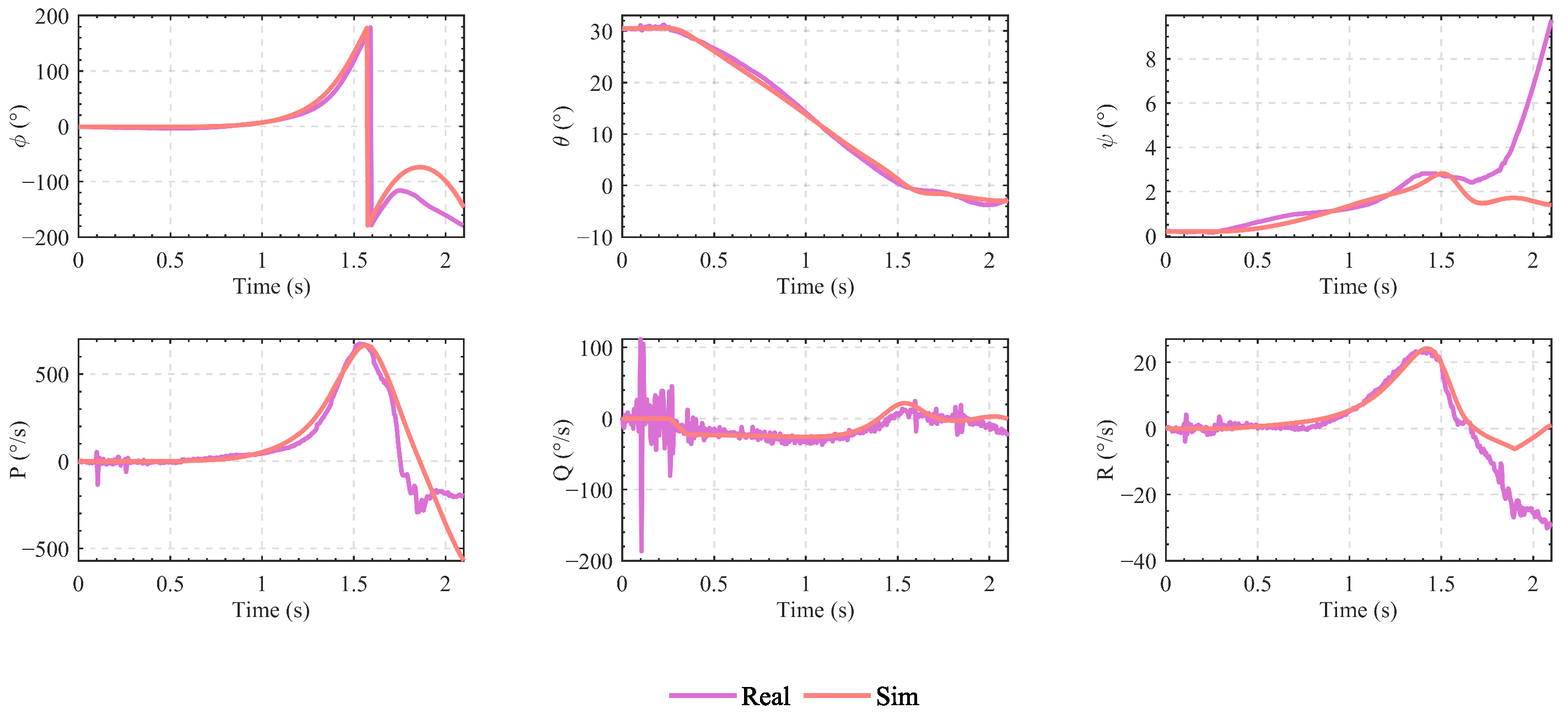 - The short ejection time results in an insufficient initial velocity, causing the relatively heavy UAV to immediately enter the programmed turn after ejection. This reduces the aerodynamic stabilization effect and exacerbates the adverse influence of gravity on the pitch channel.