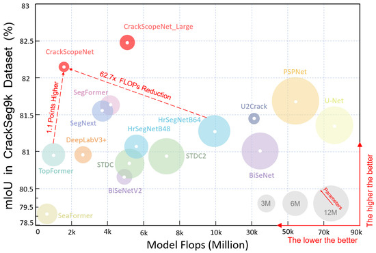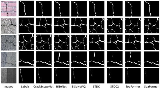As our primary objective is to achieve an exceptional balance between the accuracy of crack region extraction and inference speed, we compare CrackScopeNet with three types of models: classical general semantic segmentation models, advanced lightweight semantic segmentation models, and the latest models designed explicitly for crack segmentation, totaling thirteen models. Specifically, U-Net [30], PSPNet [31], SegNet [53], DeeplabV3+ [23], SegFormer [19], and SegNext [24] were selected as six classical segmentation models with high accuracy. BiSeNet [28], BiSeNetV2 [54], STDC [55], TopFormer [34], and SeaFormer [35] were chosen due to their advantages in inference speed as lightweight semantic segmentation models; notably, SegFormer, TopFormer, and SeaFormer are all transformer-based methods that have demonstrated outstanding performance on large datasets such as Cityscapes [56]. Additionally, we included two specialized crack segmentation models, U2Crack [52] and HrSegNet [29], which have been optimized for the crack detection scenario based on general semantic segmentation models.