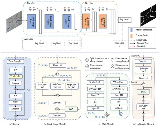 A structural overview of CrackScopeNet. (a) CrackScopeNet consists of three downsampling stages, and each stage contains N CrackScope modules and MLP modules (we refer to these two combined modules as a CrackScope block). A CrackScope module implies a multiscale branch (b) in which the input is divided into three parts along the channel dimension and an SWA module (c). The upsampling block (d) upsamples deep features and stacks them with shallow information, using SWA modules and convolutional layers for feature fusion.