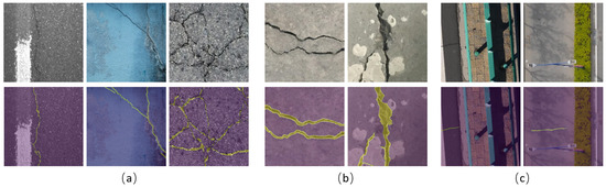 CrackSeg9k consists of 9255 images with a resolution of 400 × 400 pixels, each labeled for cracks and backgrounds. As shown in Table 2, this dataset is merged with ten smaller sub-datasets to enhance its diversity and robustness. The resulting dataset consists of various crack types, including linear, branched, webbed, and non-crack images, with examples shown in Figure 3a, ensuring that models trained on it can generalize across different crack patterns and conditions. Notably, the creators of CrackSeg9k have corrected for label noise, boosting the dataset’s reliability.