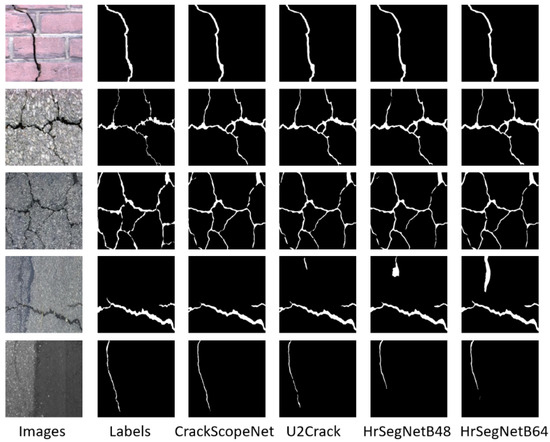 Visual segmentation results of the crack-specific segmentation models on the CrackSeg9k test set.