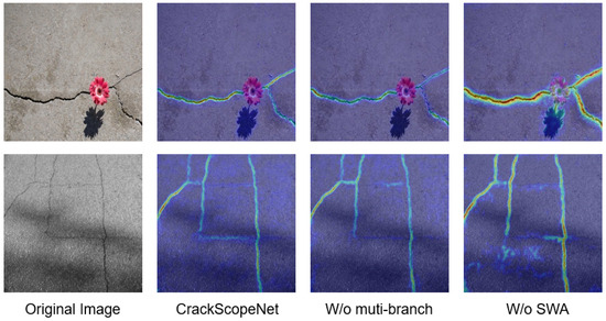 Multiscale Branch. Next, we examined the effect of the multiscale branch in the CrackScope module. To ensure fairness, we replaced the multiscale branch with a convolution of a larger kernel size (5 × 5 instead of 3 × 3). The results with and without the multiscale branch are shown in Table 6. It is evident that using a 5 × 5 kernel size convolution instead of the multiscale branch, decreases the mIoU score (−0.16%) despite having more floating-point computations. This demonstrates that blindly adopting large kernel convolutions increases computational overhead without significant performance improvements. The benefits conferred by the multiscale branch were further analyzed through the CAM. As shown in the third column of Figure 8, when the multiscale branch is not used, it is obvious that the network misses the feature information of small cracks, while the model with this branch can perfectly capture the features of cracks with various shapes and sizes.