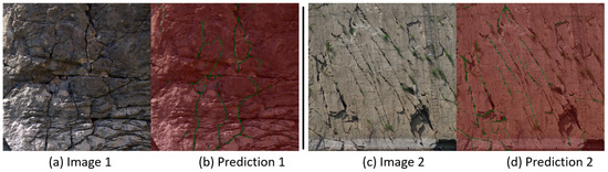 Furthermore, utilizing UAVs to monitor crack development in geological disaster scenarios can greatly aid in warning efforts. CrackScopeNet, having proven effective in infrastructure crack detection, has the potential to be adapted for these contexts through domain adaptation. We have undertaken preliminary investigations by capturing images of hazardous rock formations with UAVs and using our model to extract crack regions, as illustrated in Figure 9. These environments present more intricate crack patterns, including various types and complex curved damage. Our approach currently exhibits limitations in detecting fine cracks, particularly those that blend with the background. Our next work will focus on enhancing the model sensitivity and capacity in order to accurately identify smaller and more complex crack patterns in challenging conditions, especially in geological disaster monitoring.