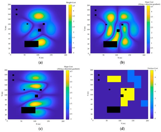 where , , and are the slope, friction, and roughness costs; , , and are the actual slope, friction, and roughness of the terrain, where is calculated with the driving direction θ; , , and are the free thresholds of slope, friction, and roughness at which the vehicle can traverse with lower cost; and represent the risky thresholds of slope and friction at which the vehicle can traverse with higher cost; , , and are the traversability boundary conditions of slope, friction, and roughness that were identified in the previous section; , , , , , and are the parameters of these functions that can be selected according to the simulation tests.