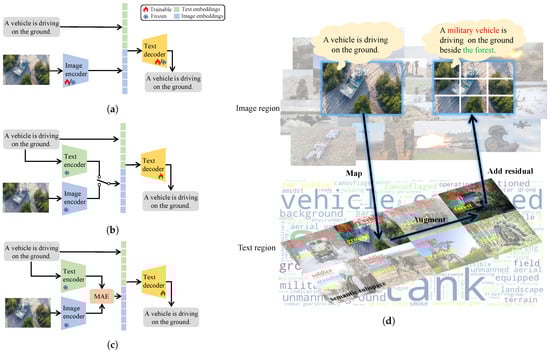 The architecture comparison of image captioning based on deep learning. Encoder–decoder architecture utilizes image embeddings as a guiding prefix (the blue square) for caption generation in both training and testing. Encoder (VL)–decoder architecture uses text embeddings in training and image embeddings in testing as guiding prefixes. A novel encoder–augmentation–decoder architecture leverages an image guiding prefix that is augmented by text through the MAE mechanism. (a) Encoder–decoder architecture. (b) Encoder (VL)–decoder architecture. (c) Encoder–augmentation–decoder architecture (our MAE-MilitIC). (d) The calculation of the MAE mechanism.