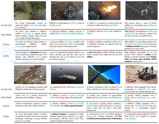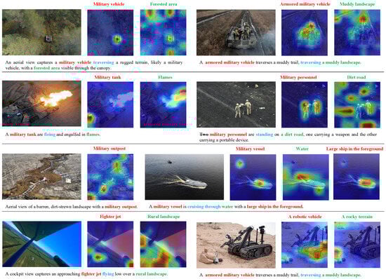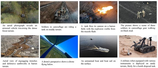 On the battlefield, low-altitude UAVs and UGVs are frequently employed in combat surveillance, targeted patrols, and strategic reconnaissance missions [1] to ensure swift responses to potential threats. Image data generated by UAVs and UGVs provide tactical information upon which critical decisions and actions are taken, especially for situational awareness and ISR (intelligence, surveillance, and reconnaissance)-type applications [2]. As a vital pathway to achieving situational awareness, the common operational picture (COP) can be delineated using scene descriptions and reference terms familiar to the commander [3]. Images that have been pre-tagged with relevant keywords or sentences can provide an advantage for the timely sharing of scene information in a COP [4]. Therefore, utilizing image captioning for the sentence-level pre-tagging of military images is a feasible solution to enhance the comprehension of military intelligence.
