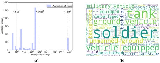 Table 1 comprehensively compares existing benchmark datasets and MOCO in terms of the category, scale, task applicability, and availability. Some typical images and captions shown in Figure 2 include military personnel (soldier, combat engineer), combat equipment (tank, boat, UAV, UGV), and the battlefield environment (trench, anti-tank obstacle). Figure 3a illustrates that the MOCO dataset contains images of various sizes that range from 224 × 224 to 1024 × 1024 pixels and include high-resolution 2K images at 1440 × 1440 pixels.