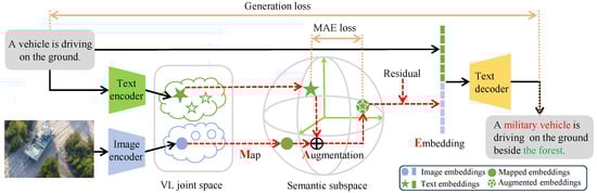 On the basis of the pre-aligned VL joint space , an MAE mechanism is proposed to enhance the semantics of image embeddings for a specific task, such as a (military) image-captioning task. We constructed the semantic subspace using relevant texts that describe the semantics we aimed to disentangle and enhance, map and onto to acquire mapped image and text embeddings and , and then augment with the semantic information contained in .