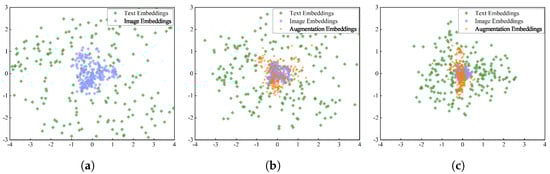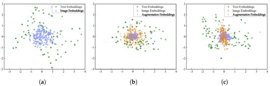 PCA visualization of image, text, and augmentation embeddings in two spaces on MOCO. Note that in the VL joint space, the image and text embeddings were almost non-overlapping. However, compared with the image embeddings, the augmentation embeddings exhibited a higher degree of overlap with the text embedding in the semantic subspace. (a) VL joint space. (b) Semantic subspace . (c) Semantic subspace .
