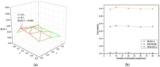 To achieve the best model performance, we employed the grid search method for parameter optimization. We selected candidate values for from [0, 0.1, 0.3, 0.5] and for from [0.1, 0.3, 0.5]. There were 12 parameter combinations in total. After training in the MOCO dataset, the experimental results are shown in Figure 9a. The best BLEU-1 result was 0.494 when the parameter combination was set to and . For the MAE-MilitIC based on PCA mapping, the number of principal components was selected from [5, 10, 20, 30, 40]. As illustrated in Figure 9b, the metrics BLEU-1, METEOR, and ROUGE-L were consistently achieved optimal values when was set to 10. Thus, we determined that the values of the three parameters were , , and .