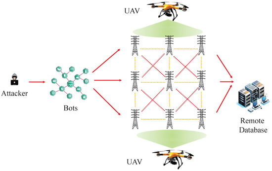 In this subsection, we first clarify the problem that this paper aims to solve. Figure 2 depicts a scenario in which SG, under a DDoS attack, is mitigated and tracked using UAVs. In this scenario, a hacker launches an attack on a target victim by controlling a botnet within the terrestrial network. This malicious traffic is then forwarded and propagated through the nodes in the SG. Such an attack can lead to various consequences. One possible outcome is that the malicious traffic is completely forwarded to the victim (potentially a specific target node, such as the control center in the SG), rendering them unable to control the power transmission status in the SG. This represents a traditional DDoS attack model. Another potential consequence is that the attacker targets certain core network links with insufficient bandwidth, causing these links to lose communication capabilities due to excessive malicious data packets occupying the bandwidth. This is the LFA mentioned earlier. Therefore, it is necessary to utilize drones to temporarily increase network capacity while tracking the attack path.