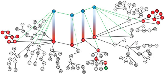 The tree topology of the simulation test [55]. The numbers in the figure correspond to the identifiers of network nodes. Red nodes indicate those that forwarded the attack traffic, while blue nodes represent the drone nodes.