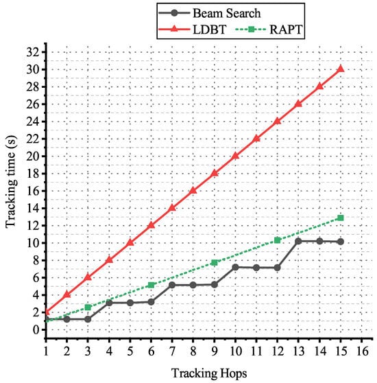 Whether compared with the growth rate of 2 s per hop in our original work, LDBT [47], or with the linear growth law of TracePack as discussed in Zakwan AlArnaout et al.’s work [57], this solution achieves a significantly lower tracking time, thus ensuring faster tracking speeds. It should be noted that in the work of Zakwan AlArnaout et al., only a partial data graph of the hop numbers was provided, without specific values. Therefore, the green dotted line in our figure is derived from extracting data points from their figure and fitting these points according to the close relationship mentioned by their author team, thereby approximating the growth trend.