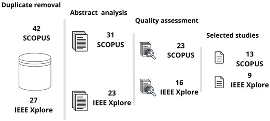 The search string yielded 42 results from Scopus and 27 from the IEEE Xplore databases. An outline of the study selection and quality assessment process is illustrated in Figure 3.