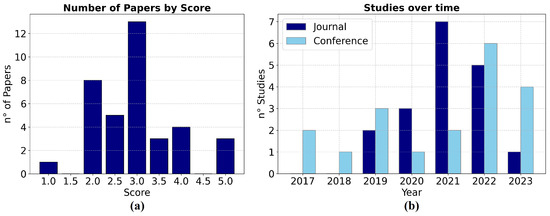 (a) Studies divided by quality assessment score. (b) Number of studies under analysis over the publication years, classified by journal or conference publication.