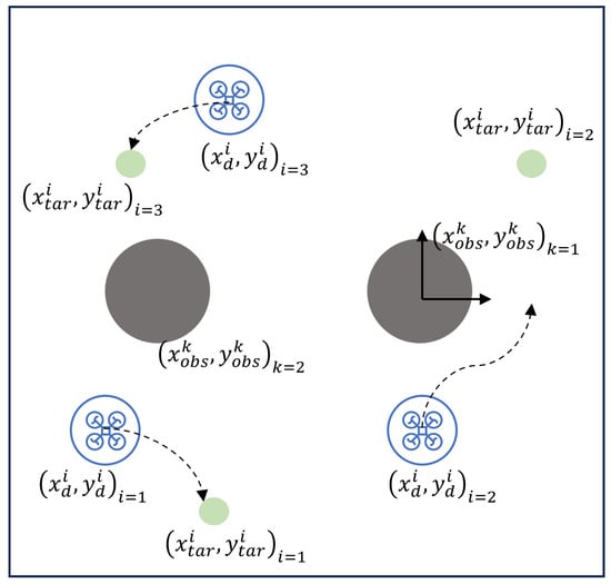 As illustrated in Figure 1, the environment contains N quadcopters (depicted as blue drones), with each drone’s position denoted by , . Additionally, there are M circular obstacles (gray circles), each with a radius of and positions denoted by , . Each drone has a corresponding target point located at , . The objective for each drone is to navigate to its assigned target point while avoiding collisions with both static obstacles and other drones. The mission of an individual drone is considered complete when its distance to the target is less than a specified threshold . The overall mission is considered successful when all drones reach their designated target points without any collisions.