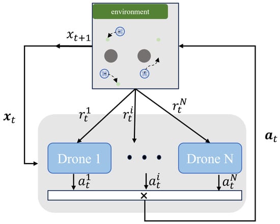 In MADRL, the Markov decision process (MDP) for single-agent scenarios is extended to handle multiple agents interacting within a shared environment. The fundamental process is illustrated in Figure 3.