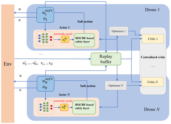 According to Theorem 3 in [31], when h satisfies the conditions outlined in (9), the system is forward-invariant within the safety set, and the control input u that meets the constraints ensures system safety at any time t. We incorporated the CBF constraints into the MADDPG algorithm to guarantee that the policy output from the RL process adheres to safety guarantees, and into RL in order to make the policy output network satisfy the safety constraints. It is necessary to make the process of optimizing and solving the security policy differentiable with respect to the input of the network, i.e., the effect of the secure policy on the reward function can be propagated back to the input in the reverse direction; therefore, we make use of a differentiable QP (DiffQP) [32] (in simulation, corresponding to python’s qpth package), and by combining HOCBF with DiffQP, we design the core architecture of this paper—a multi-agent safe RL architecture. A safety layer comprising HOCBF is employed to correct potentially unsafe actions of drones within the actor network. The specific action correction formula is detailed in Section 4.3.
