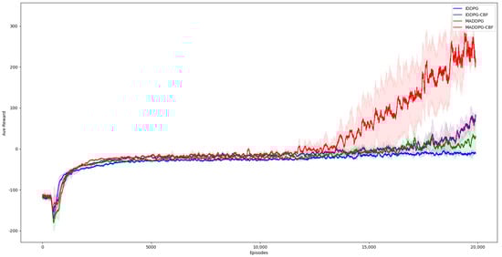 For simplicity, we present only the average reward in the SI, as depicted in Figure 6. The average reward is computed as the mean reward of three agents. Interestingly, we observe a similar trend in all algorithms, which are not affected by constraints. Compared to IDDPG and MADDPG, both IDDPG-CBF and MADDPG-CBF achieve higher rewards at the final stage of convergence, indicating that the addition of the safety layer enhances reward acquisition. MADDPG-CBF outperforms IDDPG-CBF because centralized training enables agents to choose more optimal actions from a global perspective, resulting in greater reward feedback.