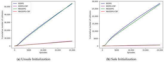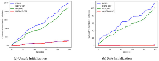 Figure 7 shows the average number of cumulative collisions per drone during the training period. As expected, a large number of collisions were observed in the MADDPG and IDDPG algorithms both in the UI and SI states, due to unsafe exploration in the early stages. In contrast, the average cumulative number of collisions in the IDDPG-CBF and MADDPG-CBF algorithms is greatly reduced and even tends to zero, indicating that incorporating CBF constraints can effectively reduce unsafe exploration, thereby validating the effectiveness of our algorithm. Figure 8 shows the average number of cumulative collisions per drone during the test simulations. It is worth noting that even during the convergence phase, IDDPG-CBF and MADDPG-CBF have far fewer collisions than their base methods.