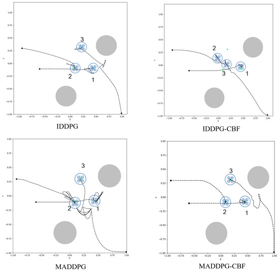 During the testing phase, we observed the trajectory plots of each drone in SI for a particular round under the same random seed, as shown in Figure 9. It is evident that all three drones exhibit anomalous trajectories in the IDDPG and MADDPG algorithms, particularly in the folded portions of the graph. These anomalies are due to sudden changes in trajectories caused by mutual collisions between the drones. Although all drones eventually reach their target points, these anomalous trajectories indicate a failure in mission completion. Although no anomalous trajectories were observed in the IDDPG-CBF, two drones still failed to reach the target point. This is also considered a mission failure. In contrast, in the MADDPG-CBF algorithm, none of the drones displayed abnormal trajectories, effectively avoiding the risk of collisions with obstacles and other team members, and successfully reaching their target points.
