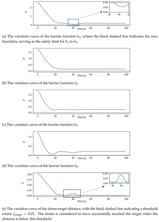 To thoroughly analyze the maneuvering decisions of the drones throughout the process, we selected drone 1 as the primary object of study. We plotted several critical metrics including the barrier functions (where , , , ), distance to the target, output actions, and positional variations during a specific round. This approach enables a deeper understanding of drone 1’s decision-making process in obstacle avoidance and target convergence, providing a clearer evaluation of its trajectory planning and control actions.