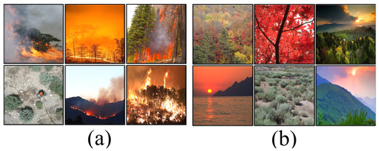 Sample images of the employed fire detection dataset: (a) fire and (b) no fire.