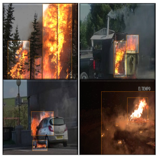 In this work, only the fire-related images are labeled accordingly. The annotation process is facilitated by Roboflow software (Version 1.1.37), which is renowned for its dataset annotation and labeling capabilities. The labeled datasets of fire samples are shown in Figure 2. Image annotation is performed through a bound box or segmentation mask. After completing the annotation, all annotated images are manually checked to ensure that no image is incorrectly or partially annotated.