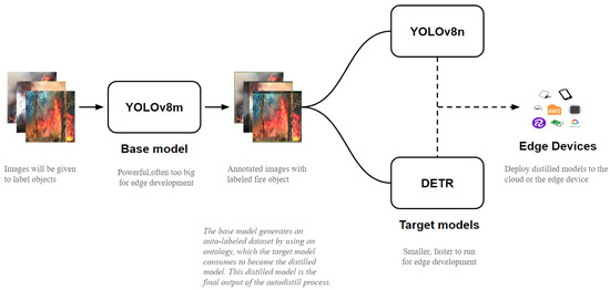 Figure 3 shows the Autodistill process and selected models. In this work, YOLOv8m is used as the base model to label the zero annotated images. At first, a pretrained YOLOv8m model has been used to annotate images. The base model generates a bounding box-labeled dataset for target models. After processing the dataset, the target models YOLOv8n and DETR became the distilled model in this work. Finally, the YOLOv8n distilled model has been deployed in the proposed Raspberry Pi 5 edge deceive for fire detection.