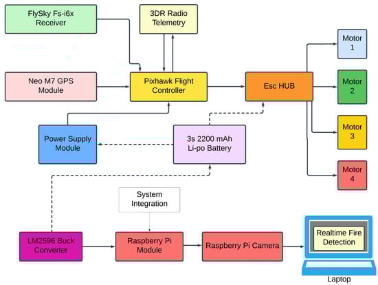 The overall hardware setup and connection diagram of the proposed automatic deep learning-based fire extinguishing drone have been presented in detail in Figure 5 and Figure 6, respectively. The DJI F450 drone is powered by the 3S 2200 mAh Li-Po battery, which would provide a flight time of approximately 12 min, judging the individual current draw of each motor at peak thrust (10 A). The whole connection is booted via an XT60 connector, which would handle a 60 A current maximum. The flight controller draws the battery power via the power supply module, operating on only 5 V. Next, the radio receiver draws the necessary voltage from the flight controller via a common power bus. The power supply module has two objectives, i.e., to provide power and monitor the battery voltage and current. There is a built-in PCB power distribution board in the drone’s chassis. The PCB helps to supply the battery power to all the ESCs that run on 12 V. Through the help of ESCs, all the BLDC motors run with a nominal voltage of approximately 11.3 V. Lastly, the Raspberry Pi 5B module consumes battery power. This portion of power goes through the LM2596 DC–DC converter. The converter decreases the voltage significantly so the Pi module can work smoothly.