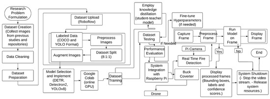 Figure 8 illustrates the proposed automatic fire detection system’s working progressions, which involve the following tasks. The proposed automatic fire detection system begins with defining research objectives and assembling a dataset of fire incident images labeled and augmented using tools like LabelImg and Roboflow API. Advanced deep learning models such as DETR, Detectron2, and YOLOv8 are selected and enhanced through knowledge distillation, followed by training on Google Colab Pro. The trained model, YOLOv8n, is then integrated into a Raspberry Pi 5 microcontroller and drone system for real-time fire detection. The system processes video feeds from the drone, detecting fires and sending notifications to aid in prompt hazard management.
