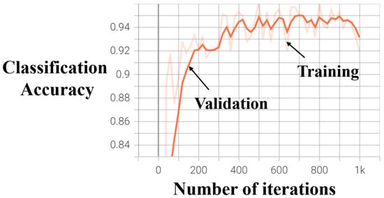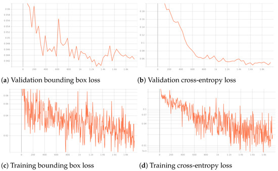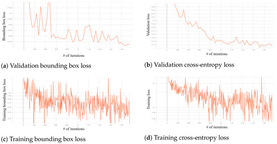 Validation and training losses across the number of iterations for the DETR student model applied to the proposed fire detection task are depicted in Figure 18. Figure 18a,b show the validation bounding box and cross-entropy losses, respectively, both demonstrating a downward trend, indicating improved model performance with more iterations. As expected, the training bounding box and cross-entropy losses show gradually decreasing fluctuations, reflecting the model’s learning process and convergence over time.