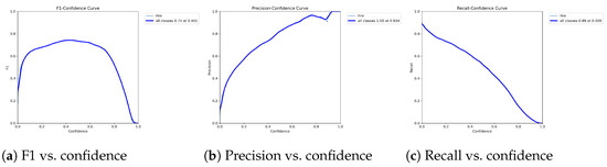 Figure 16 presents the precision and recall evaluation of the distilled YOLOv8n student model. The model demonstrates the enhanced performance compared to the base YOLOv8m and undistilled YOLOv8n models. The precision–confidence curve for the distilled YOLOv8n model shows that, as the confidence threshold increases from 0.0 to 1.0, precision significantly improves, achieving a value of 1.00 at a confidence threshold of 0.989 for all classes. Conversely, at lower confidence thresholds, precision is lower due to a higher number of false positives. As the threshold increases, the YOLOv8n model becomes more selective, significantly improving precision.