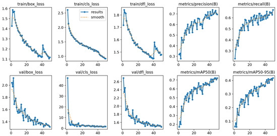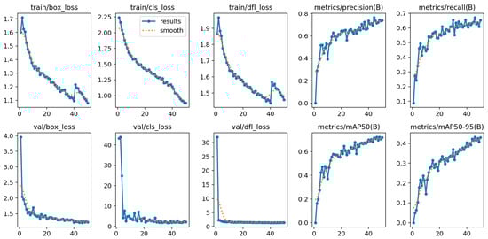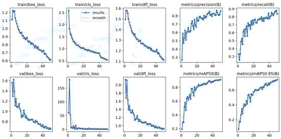 Figure 17 illustrates the performance metrics of the YOLOv8n student model across different epochs, showing a consistent decrease in training and validation losses (box, classification, and DFL losses) as the epochs progress. Concurrently, the precision, recall, mAP50, and mAP50-95 metrics notably improve, indicating enhanced model accuracy and effectiveness over time.