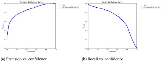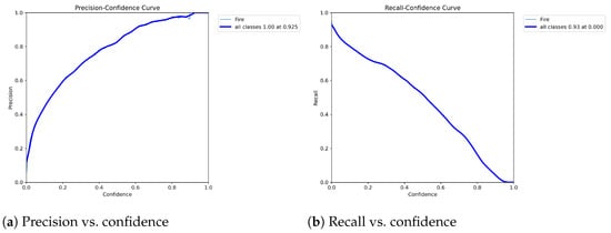 Figure 14 presents the precision and recall vs. confidences of the YOLOv8m base model. The precision–confidence curve indicates that, as the confidence threshold increases from 0.0 to 1.0, the precision rises from near 0.0 to approximately 1.0 for the fire class. At lower confidence thresholds, precision is lower due to a higher number of false positives. As the threshold rises, the model becomes more selective in improving precision. Notably, at a confidence threshold of 0.925, precision reaches 1.00. Similarly, Figure 14a shows how recall decreases as the confidence threshold increases for the fire class. At the lowest confidence threshold (0.0), recall is highest, indicating that the model identifies 93% of fire instances. As the confidence threshold approaches 1.0, recall steadily drops to near 0.