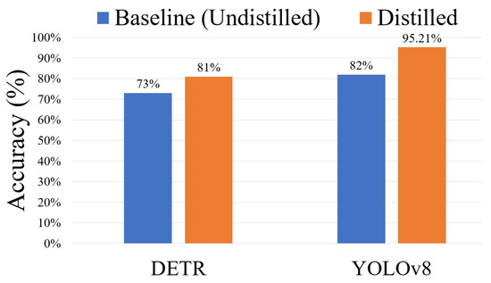 Figure 19 illustrates the accuracy improvements achieved through model distillation for both DETR and YOLOv8 models. The baseline (undistilled) DETR model achieves an accuracy of 73%, which increases to 81% after distillation, employing the advanced Autodistill technique. Similarly, the baseline YOLOv8 model shows an accuracy of 82%, which significantly improves to 95.21% with the application of distillation techniques. This circumstance demonstrates the effectiveness of the applied knowledge distillation techniques in enhancing the performance of the proposed fire detection task.
