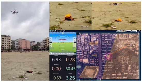 Finally, the applied AI-based deep learning models and Raspberry Pi 5 edge computing integrated drone have been tested in real-time for instantaneous fire event detection. The applied YOLOv8n model has been deployed to the embedded device because of its superior performance. The experiments were performed in the Mirpur area of Dhaka, Bangladesh, in June 2024. The drone maintained an average height of 6.90 m (22.64 feet) and a flight time of approximately 10 min. Figure 20 depicts the various stages of the operation: the drone in flight, the fire on the ground, the ArduPilot control interface, and the live telemetry data showcasing the drone’s altitude, speed, and positioning over the target area.