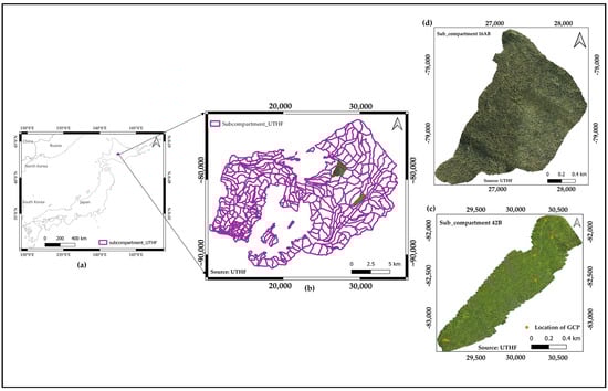 (a) Location map of the University of Tokyo Hokkaido Forest (UTHF); (b) location map of the selected two Sub- compartments in the UTHF; Orthomosaics of Sub-compartment (c) 42B and (d) 16AB.