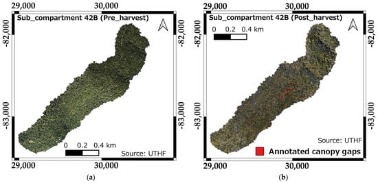 Aerial orthophotos of Sub-compartment 42B’s (a) pre-selection harvesting and (b) post-selection harvesting.