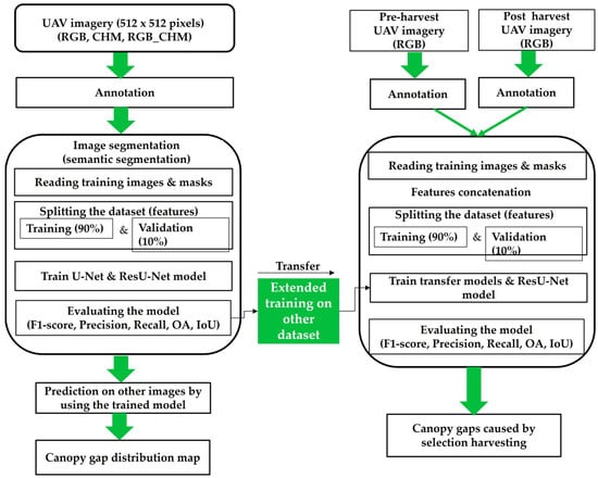 This study compared the U-Net model with the ResU-Net model, which integrates U-Net with a Residual Network, to evaluate their effectiveness in canopy gap detection using UAV imagery. After identifying the best-performing model, we implemented it as a transfer model to detect canopy gaps caused by selection harvesting. To ensure compatibility, we conducted extended training to normalize the image resolution of the new dataset with that of the transfer model. The general workflow of the study is shown in Figure 4.