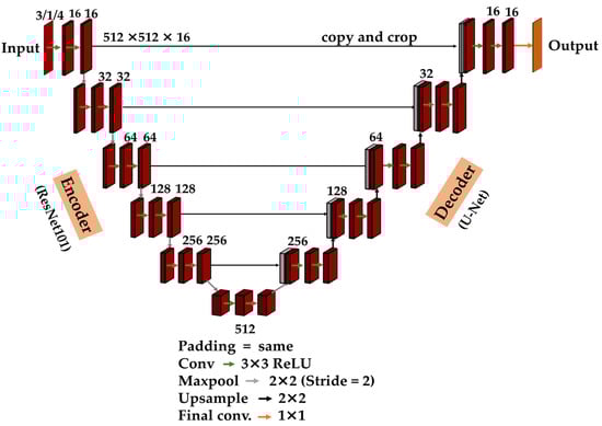 An effective approach to address the gradient vanishing issue in very deep networks is the use of Residual Networks (ResNets). Proposed by He et al. (2016) [], ResNets incorporate residual blocks that allow gradients to flow more directly through the network layers. These blocks contain shortcut connections that aid in training deeper networks by mitigating the vanishing gradient problem, thereby enhancing the model’s ability to learn intricate patterns and details from the input data [,]. Consequently, ResNets can be used to enhance the training of deep U-Net models by providing a more robust gradient flow, which can lead to better performance in complex image segmentation tasks.