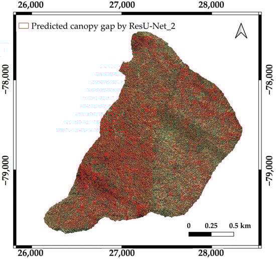 According to Table 4, similar to the case of the Sub-compartment 42B dataset, the performance of the ResU-Net_2 model with the RGB dataset was the best compared to other models in terms of all accuracy results. Additionally, as in Section 3.1, the ResU-Net_2 model exhibited better performance in distinguishing shadows from canopy gaps. Figure 7 shows the distribution of canopy gaps predicted using the ResU-Net_2 model. The visualized figures for the predictions by the remaining models can been seen in Figure A2 (Appendix A).