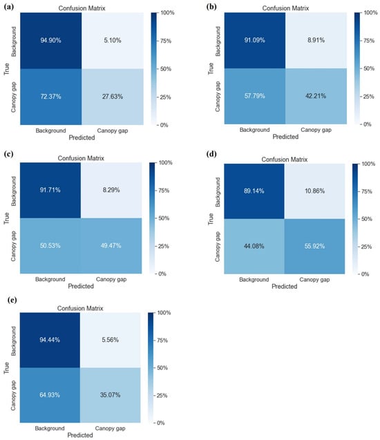 Confusion matrix of canopy gap detection by selection harvesting by using transfer models: (a) by the transfer model using the Sub-compartment 42B dataset (before extended training); (b) by the transfer model using the Sub-compartment 16AB dataset (before extended training); (c) by the transfer model using the Sub-compartment 42B dataset (after extended training); (d) by the transfer model using the Sub-compartment 16AB dataset (after extended training); and (e) by the ResU-Net model.
