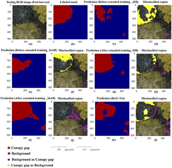 According to the confusion metrics (Figure 8), the transfer models using the Sub-compartment 16AB dataset showed a slightly higher rate of prediction of canopy gap resulting from harvesting in both cases of before and after extended training (42.21% and 55.92%), while the transfer models using the Sub-compartment 42B dataset were able to detect the canopy gaps at rates of 27.63% and 49.47%. Meanwhile, the ResU-Net model could predict the canopy gap at a rate of 35.07%, which was lower than all of the transfer models except the transfer model using the 42B dataset (before extended training). However, the rate of misclassification from the background class to the canopy gap class by the ResU-Net model was the lowest (5.56%). Among the transfer models, the misclassification rates of the models using 42B (in both cases of before and after extended training) (5.10% and 8.29%) were lower than those by the models using 16AB (8.91% and 10.86%). Some predicted results are visualized in Figure 9.