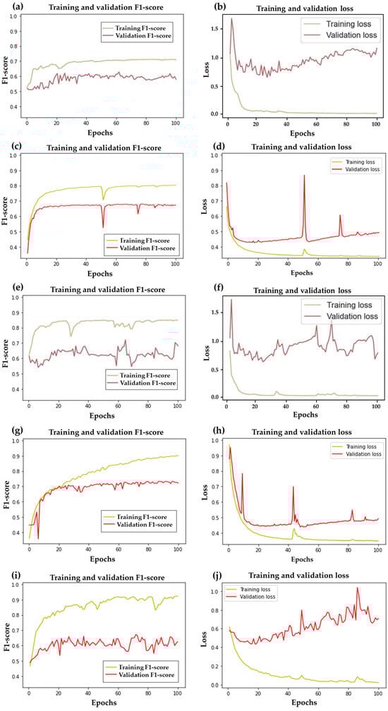 Training and validation accuracies and losses of (a,b) the transfer model using the Sub-compartment 42B dataset (before extended training); (c,d) the transfer model using the Sub-compartment 16AB dataset (before extended training); (e,f) the transfer model using the Sub-compartment 42B dataset (after extended training); (g,h) the transfer model using the Sub-compartment 16AB dataset (after extended training); and (i,j) the ResU-Net model.