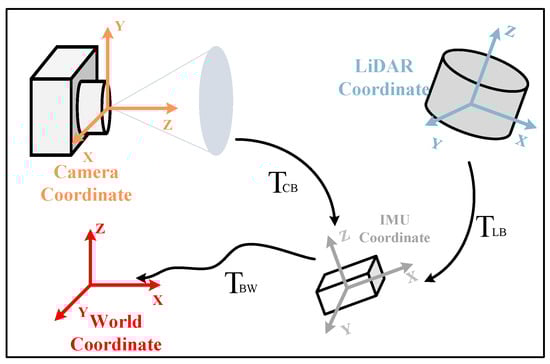The schematic diagram of coordinate transformation. and represent the external parameter from camera and LiDAR to IMU. represents the transformation from the body frame to the world frame.