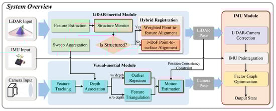 An overview of our system is illustrated in Figure 2. The IMU and visual modules provide prior poses and constraints to the LiDAR module, which is the main component of the system that uses motion estimation from coarse to fine. Initially, the camera input frequency reconstructs a LiDAR sweep to guarantee synchronized transmission between various sensors. Then, using cross-validation to assess the projection errors of visual feature-associated LiDAR points under various perspectives, the depth of visual features with large approximation errors and measurement noise is eliminated by outliers rejection. By utilizing temporal synchronization, the vision module receives the LiDAR pose from the previous instant, which helps to provide a position consistency constraint that enhances the accuracy of the camera pose estimation. To reduce the drift of the feature-based LiDAR module in scenes with fewer features, a direct point cloud registration method with IMU-constrained point-to-Gaussian surface error is proposed to be incorporated into the pose estimation.
