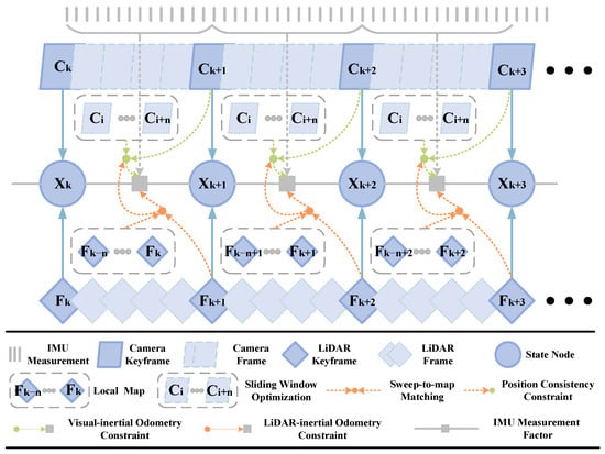 where is the uncertainty matrix of LiDAR and visual poses, which can be calculated based on the sensor measurement noise. is the marginalized prior, consisting of states and observations before the oldest state in the sliding window. The factor graph is shown in Figure 3.