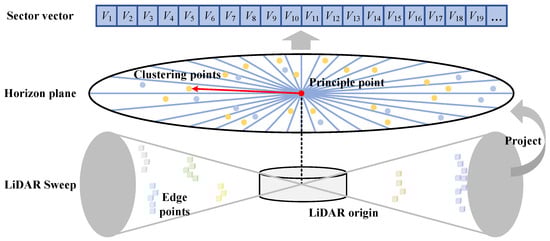 The edge points are extracted if greater than preset threshold, . Then, all edge points of the current sweep are projected onto the horizontal plane, which is divided into regions. The direction from the LiDAR origin to the edge points is used to allocate the edge points on the horizontal plane. Assume the positions of the edge features in the horizontal plane follow a Gaussian distribution. In each region, the 2D positions will be used as samples for local kernel density estimation, iteratively moving in the direction of increasing density. As a result, the sample points will eventually converge at the local maximum density, and the points that converge to the same local maximum are considered members of the same cluster. The final clustering result is the set of points in the region with the highest density of edge points. Figure 4 illustrates the aforementioned aggregation process. The -dimensional vector is obtained by forming the results of all regions: