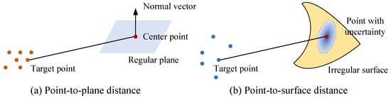 The model of the aligned point. (a) is the point-to-plane model that is employed in structured scenes. (b) is the point-to-surface model with uncertainty for aligning irregular ground points.